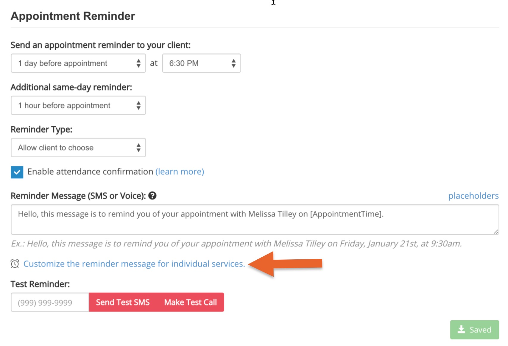 - Customize the SMS reminder message for specific services by clicking on the link Customize the reminder message for individual services.