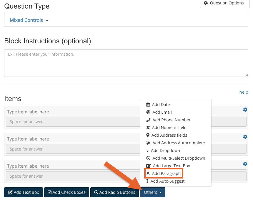 - In the Type paragraph here box, manually type the mapped label. Since PracticeQ's forms are secure, you may add any mapped field you wish. See the rules for typing mapped labels below.