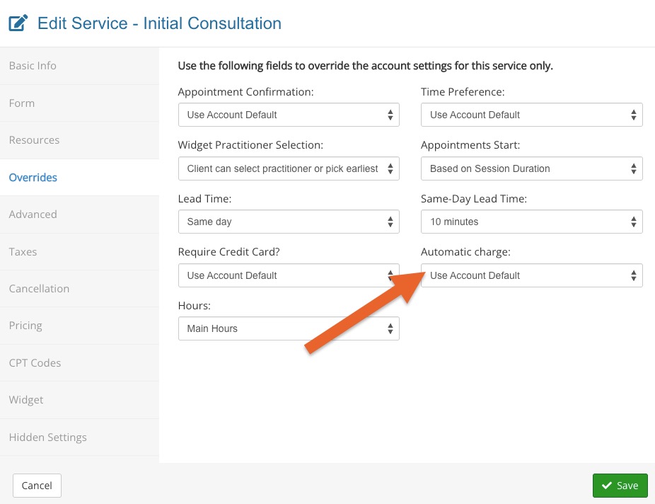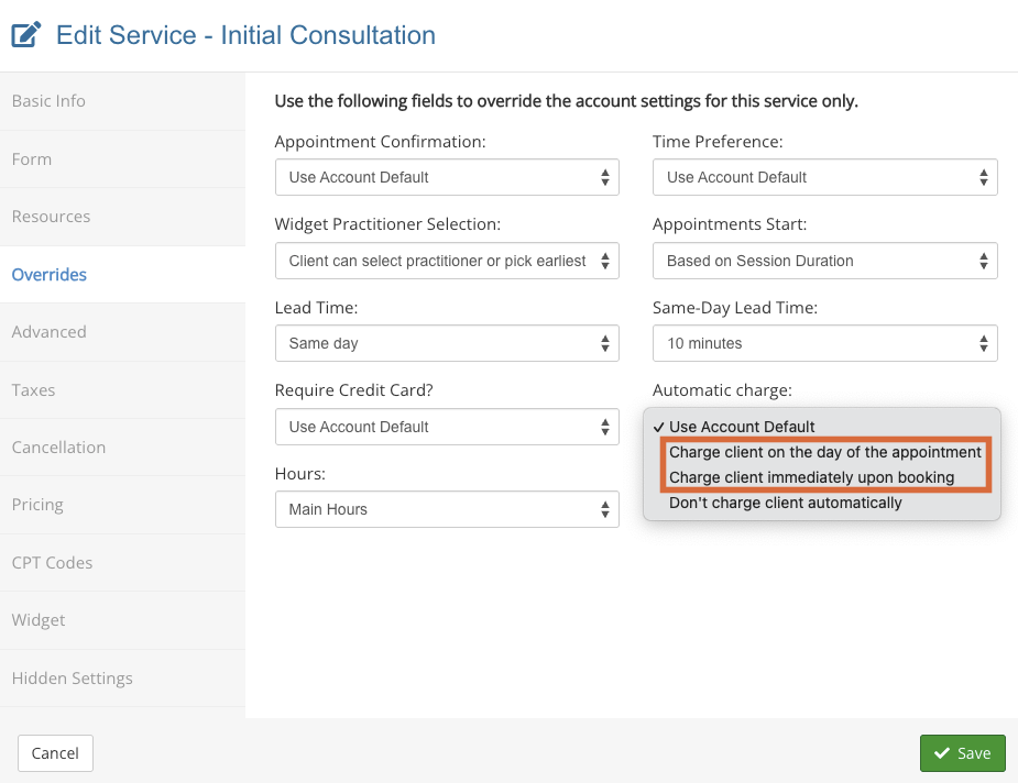 - In the service's Override settings, the Automatic charge setting is set to Charge client on the day of the appointment OR Charge client immediately upon booking