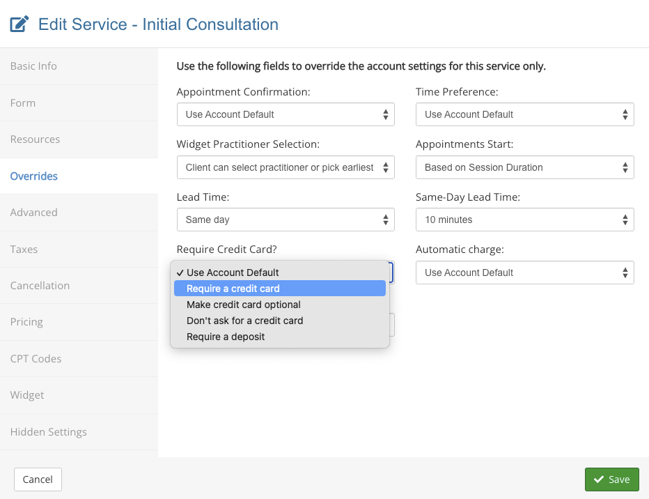 - PracticeQ will not request a credit card when the client books the $0 service UNLESS in the service's Override settings, the Require Credit Card? field is set to Require a Credit Card.