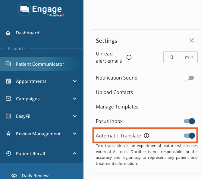 - If you wish for AI Translation to be on all the time, click Patient Communicator and click the gear wheel icon.