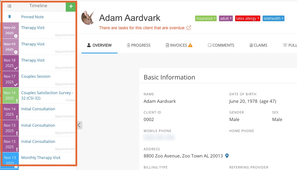 The timeline is is one of the most powerful features in a client’s profile, providing a clear visual of the client's sessions, notes and forms.