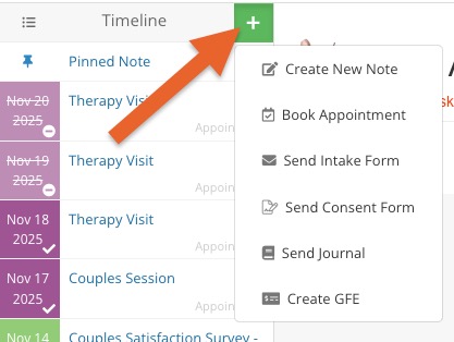 - Click the green plus sign icon and an actions menu will display. You can start a note, book a session, send a form or journal, and even create a Good Faith Estimate from the client timeline.