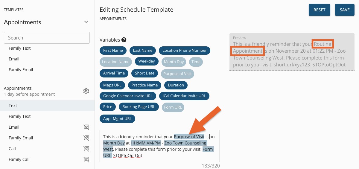 - The Purpose of Visit will show as Routine Appointment in the Preview; when sent to clients, it will display the service name for their scheduled appointment.