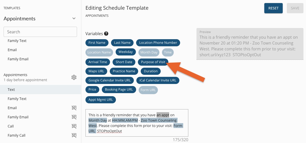 Pull your service names into appointment reminders with the Purpose of Visit variable!