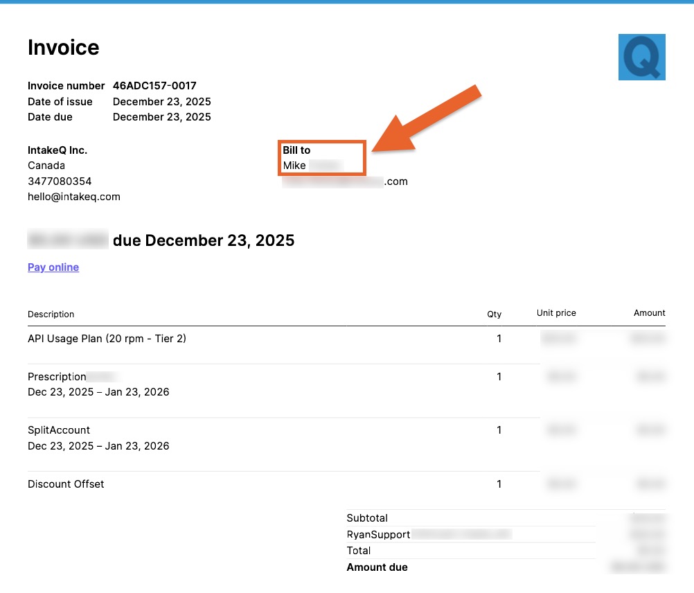 Available Setting: Change Name on IntakeQ Subscription Invoice