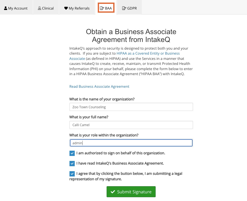 Because IntakeQ has access to your clients’ Protected Health Information, it’s important to have a Business Associate Agreement, or BAA, on file.