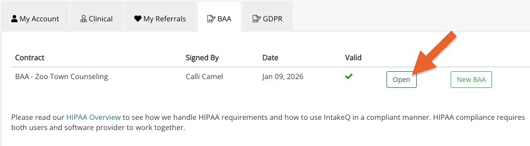 - Once the BAA is signed, click Open at any time to review or download it.