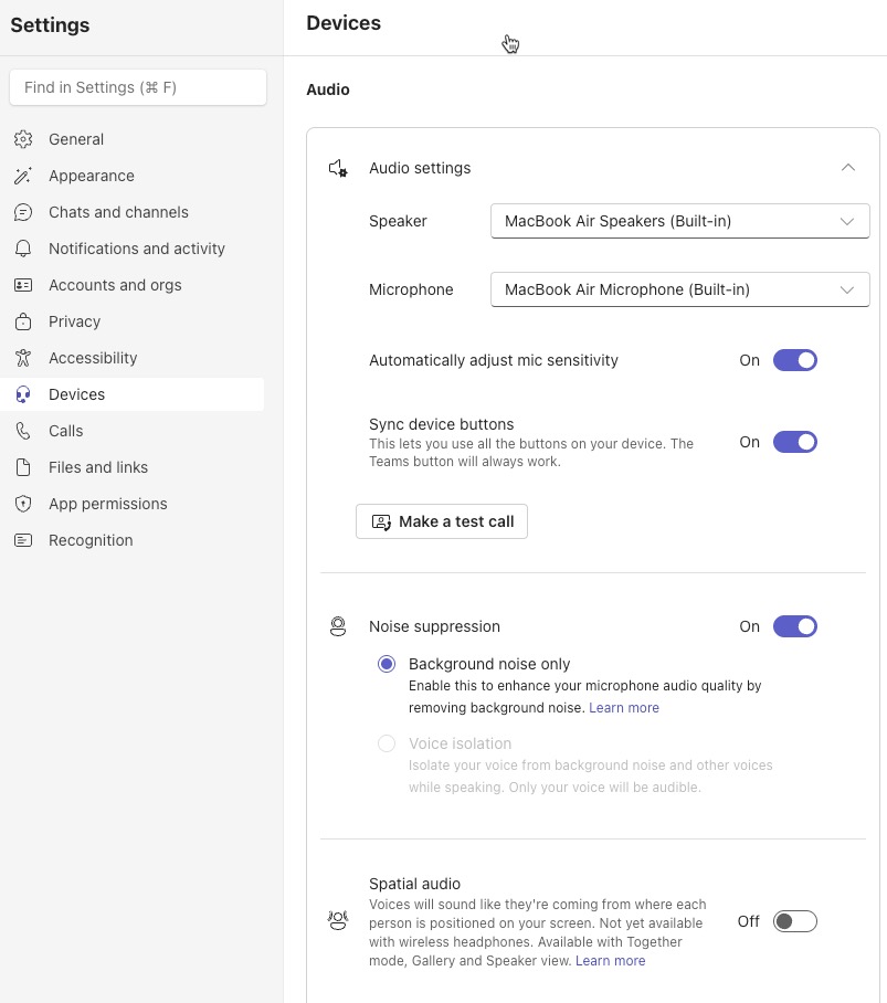 - If you are going to be a noisy environment for the call, enable the Noise suppression settings.