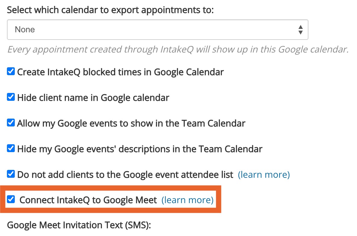 - Under the Synchronize with your Google Calendar heading, uncheck the box labeled Connect IntakeQ to Google Meet.