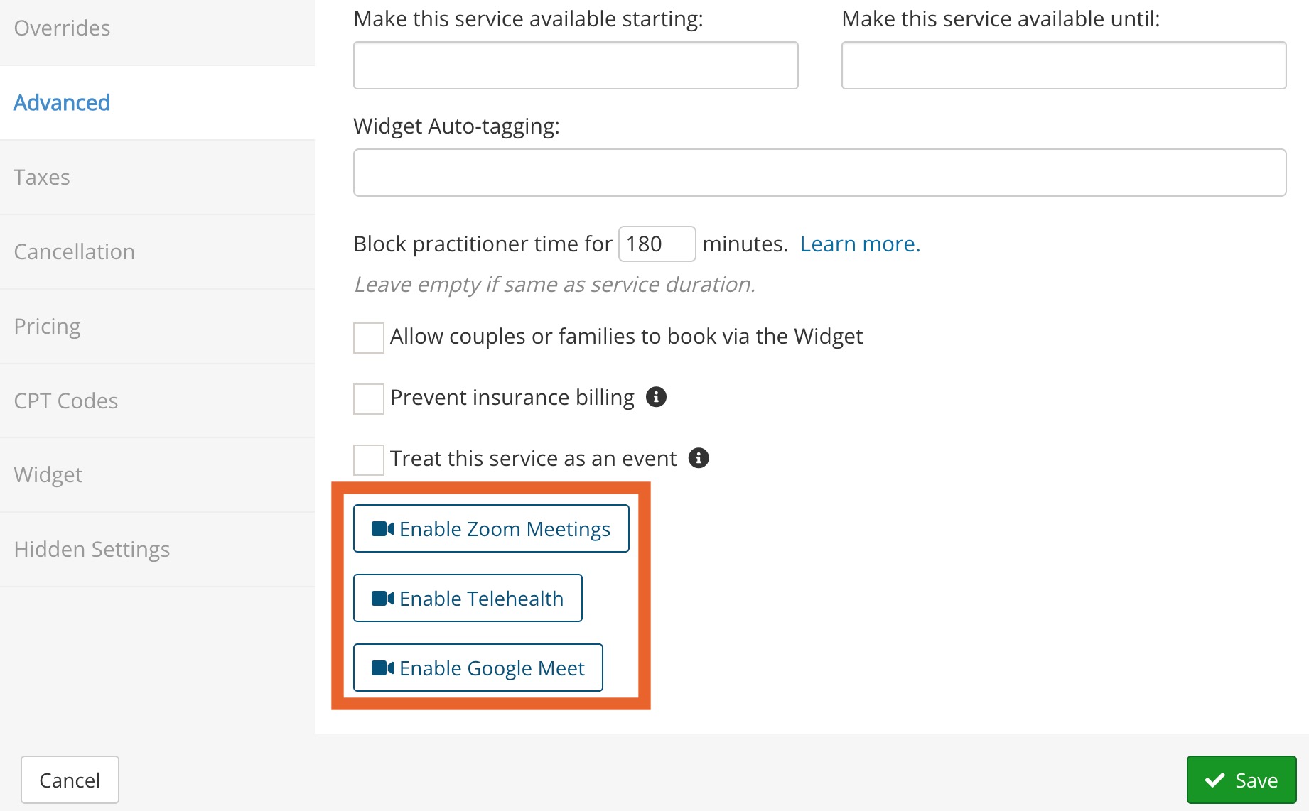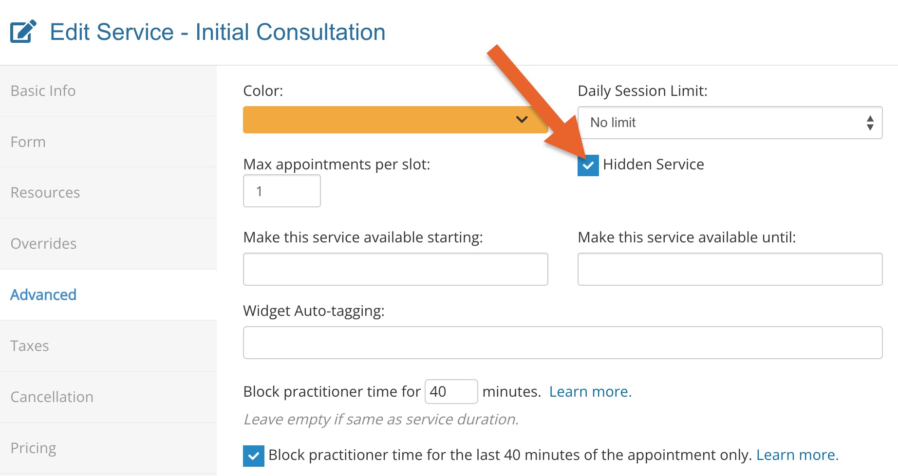 - Check the box labeled Hidden Service. This will hide the service in the booking widget, preventing clients from booking it.