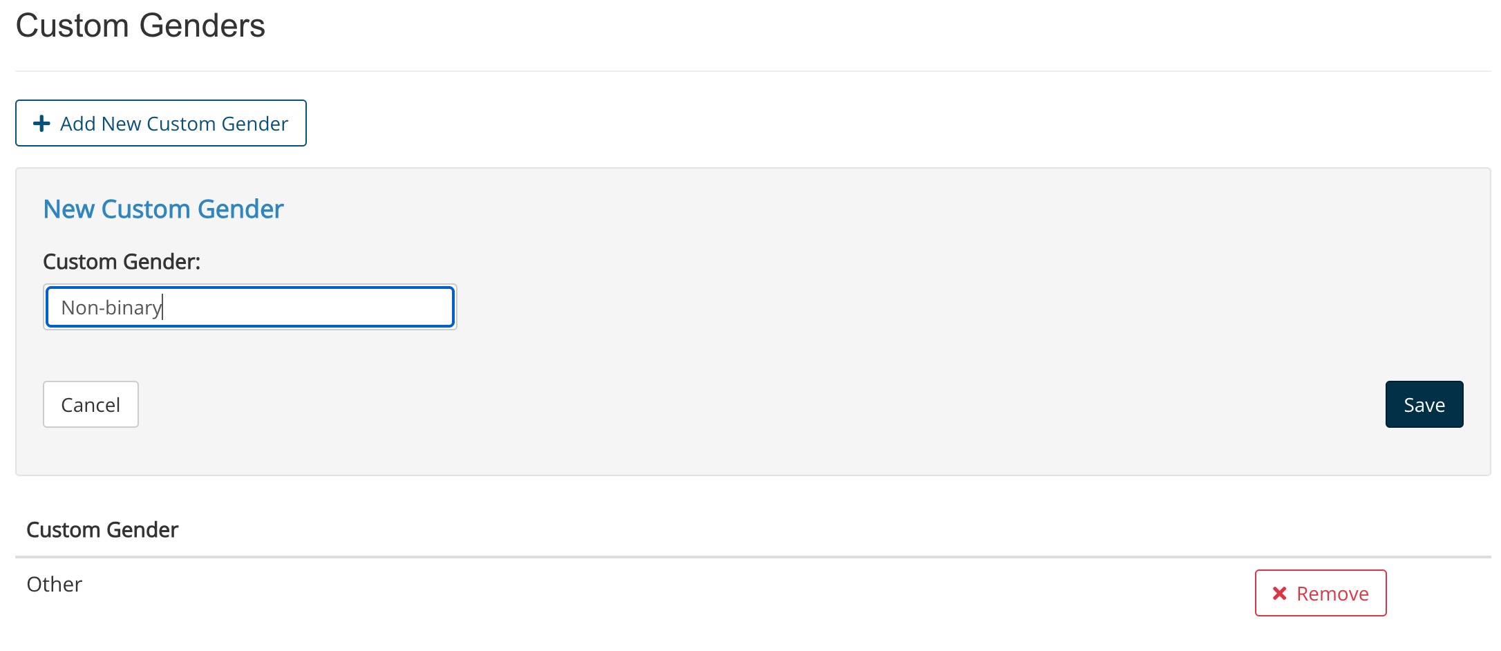 - Click the Add New Custom Gender button under the Custom Genders heading.
