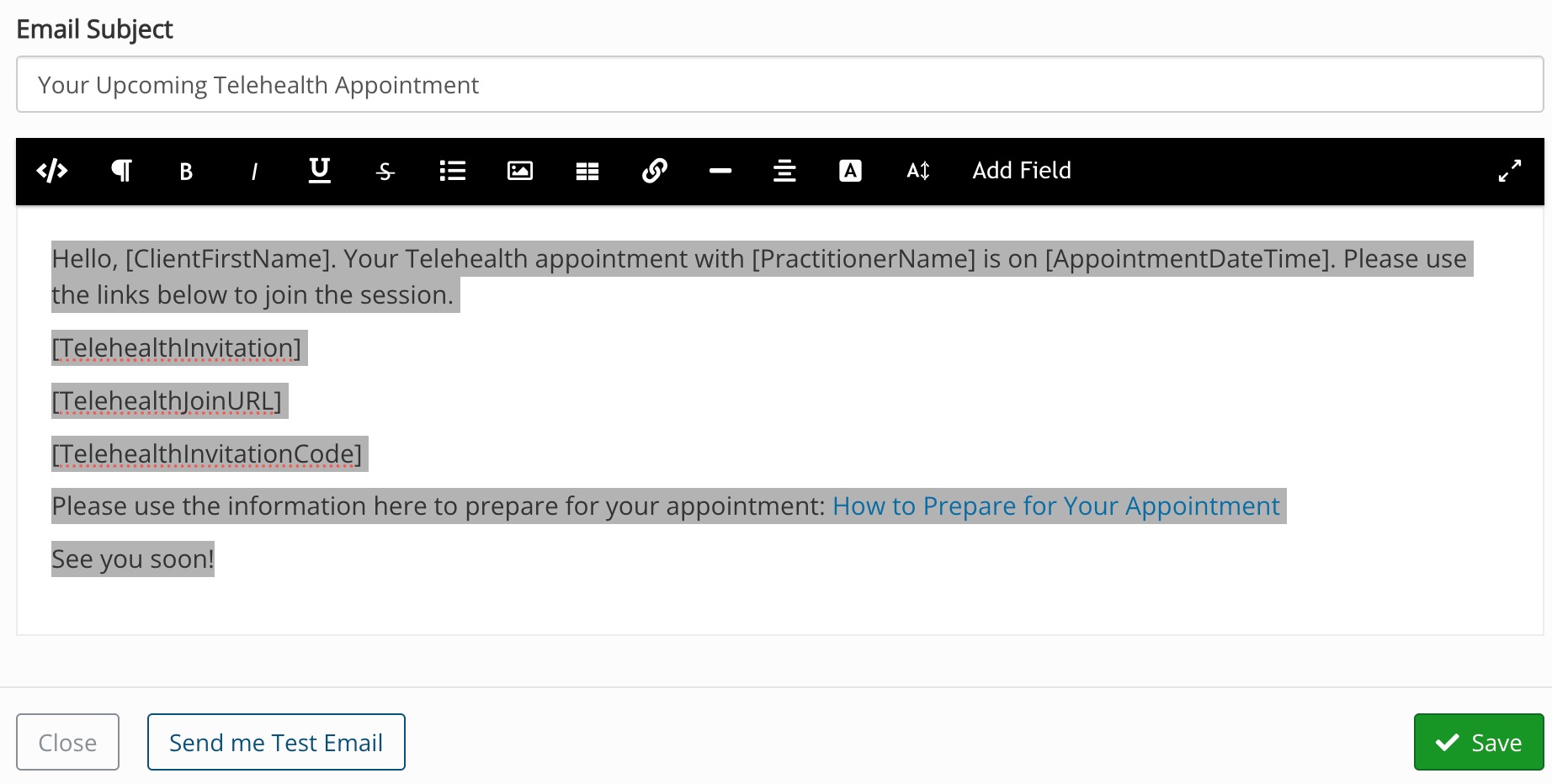 - Replace the bracketed PracticeQ variables with the blue Engage variables. Simply click them from the menu above to insert them.