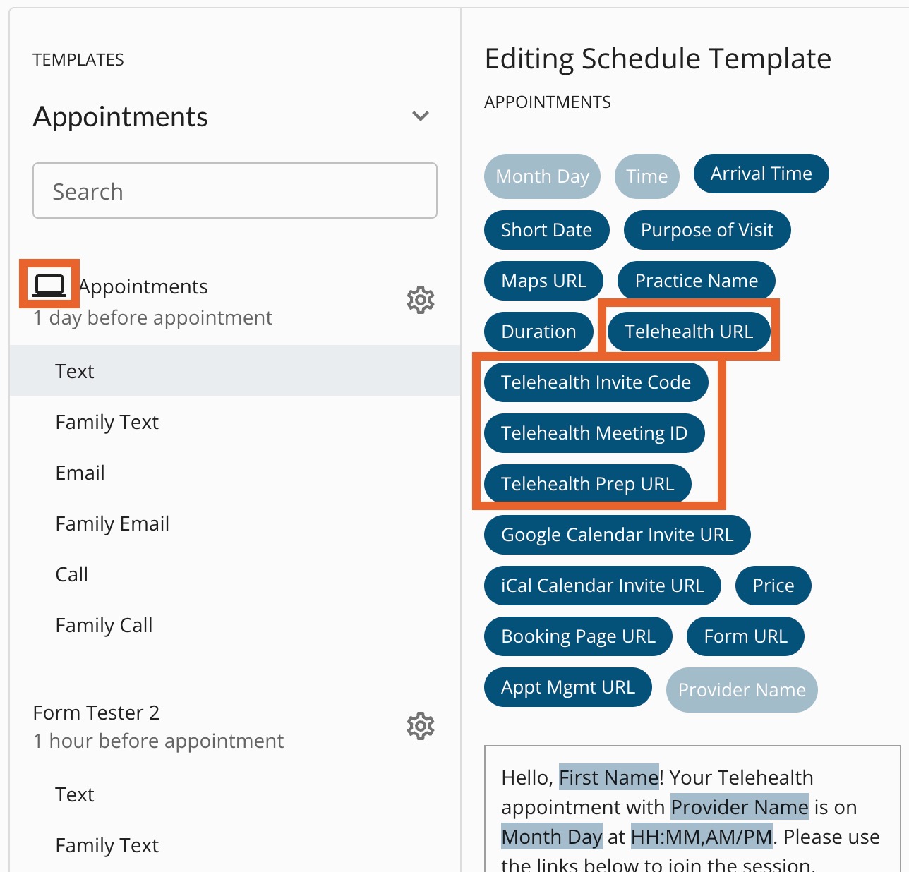 - Click Save. You will see a computer icon next to the reminder, indicating that it is designated as a Telehealth reminder.