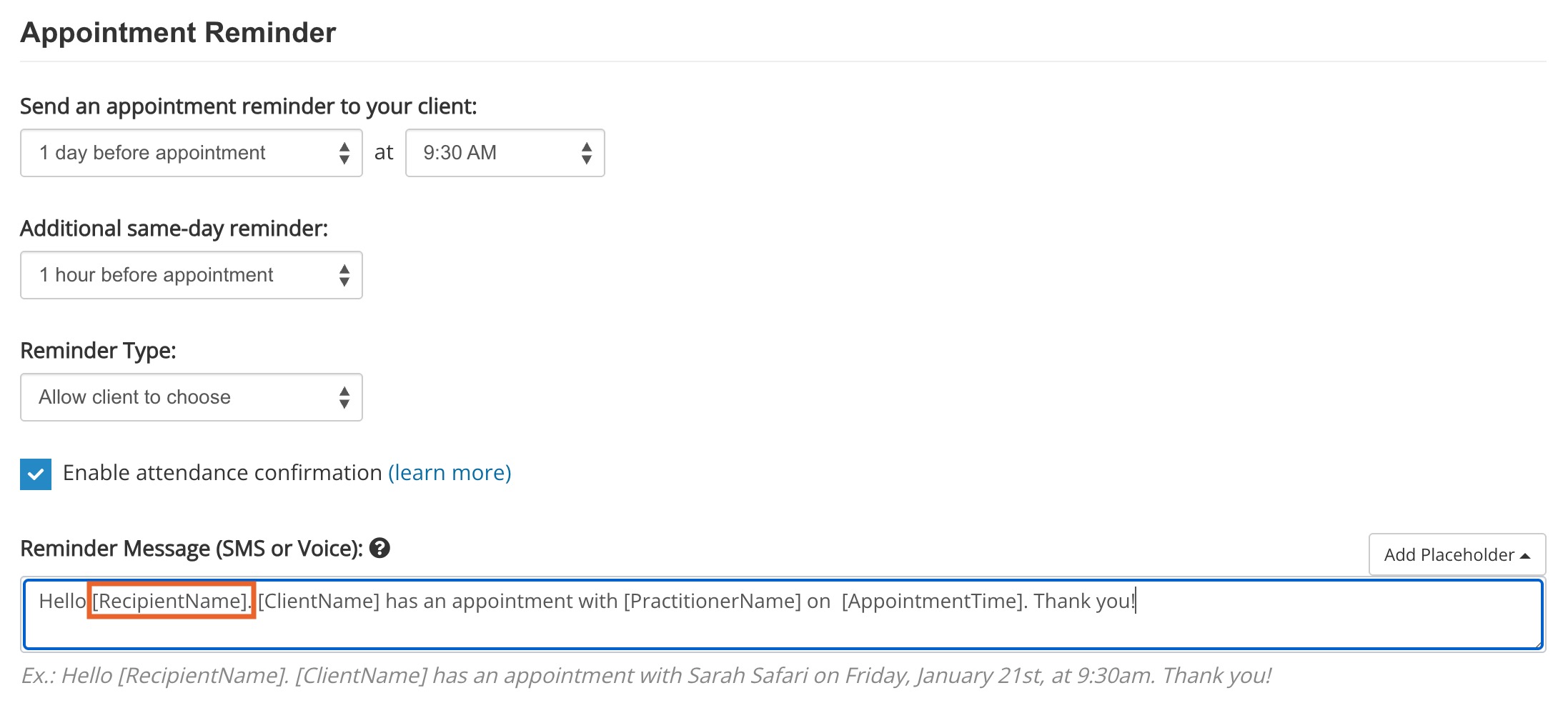 - In the Reminder Message field, manually type the following placeholders as needed: