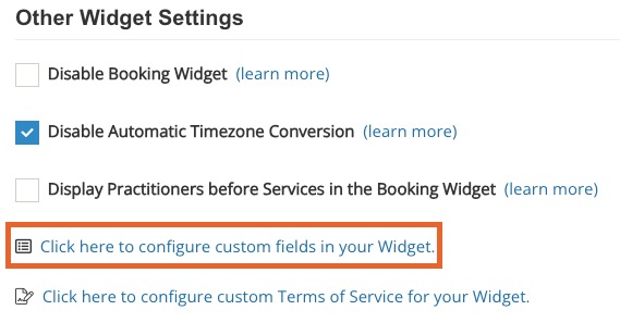 - Scroll down to Other Widget Settings and click the Click here to configure custom fields in your Widget link.