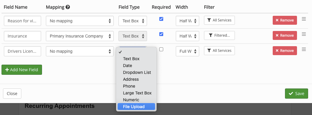 - In the Field Type dropdown, select the kind of information being asked. One useful option is File Upload. This enables file attachments during the booking process, allowing clients to upload documents such as a driver's license or insurance card.