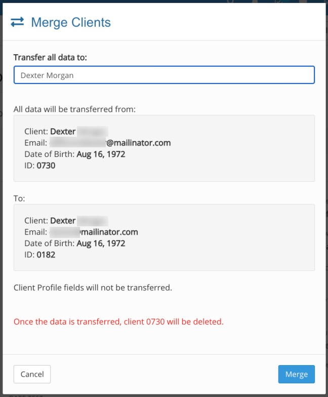 If you have accidentally duplicated clients in your account, you have the option to merge them into a single client, making their records easily accessible from a single client timeline.