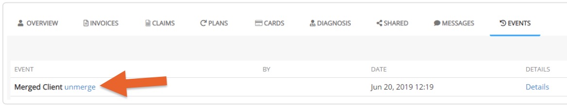 - Click the unmerge option to reverse the merge you performed and the client that was deleted will be restored, along with their data.