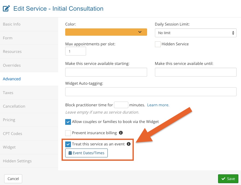 - Once you have enabled this option, click Event Dates/Times to set up when the event should be available. Finally, set up a time block on your calendar if this event cuts into hours where other services can normally be scheduled. To learn how to set time blocks, read the following article: Block Time Availability from my PracticeQ Calendar.