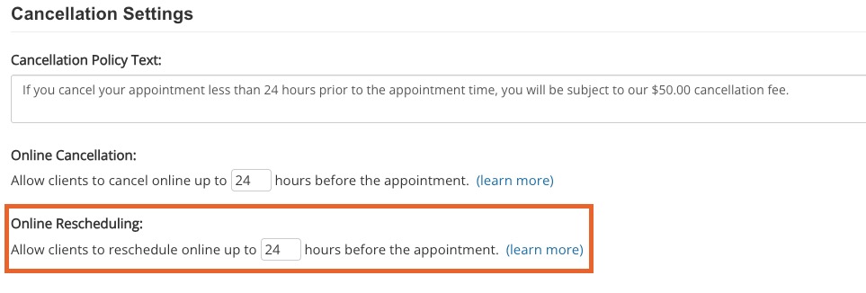 Choose how far in advance a client is allowed to reschedule an appointment. The reschedule setting is separate from the cancellation policy, in case you want to be more flexible with last minute changes.