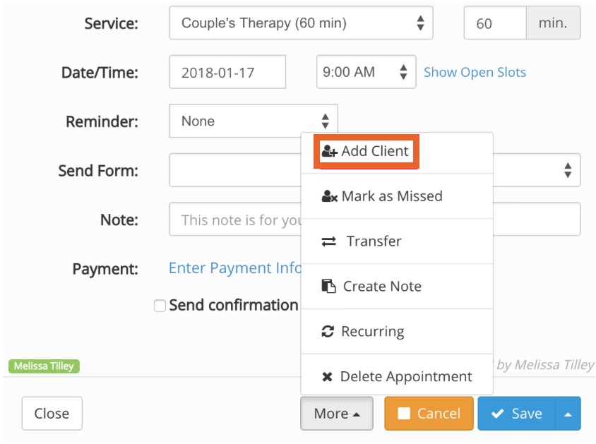 - To add a client to an existing appointment, select Add Client from the More dropdown menu.