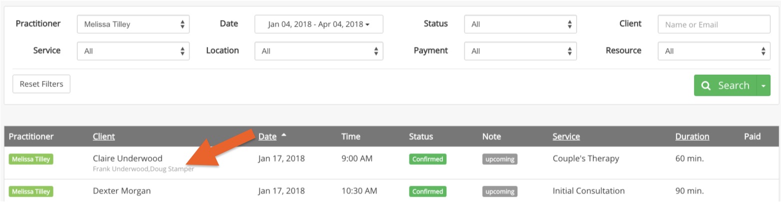 - You can easily identify appointments with multiple clients on the Appointment List page. Note in the image below that the names of the additional clients display underneath the main client's name.