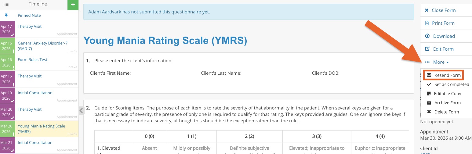 Sometimes a client loses the original form invitation email to access their form, or the questionnaire form expires before they complete it. Resend the original form invitation email to the client, with a new password, so that the client can resume the form where they left off.