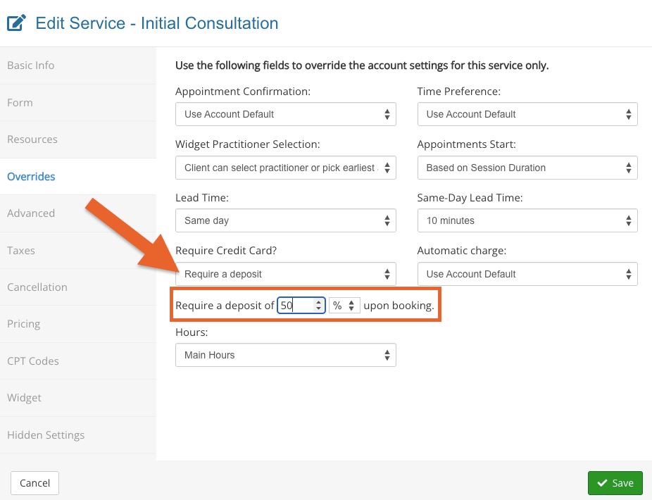 - In the Require Credit Card? dropdown menu select Require a deposit.