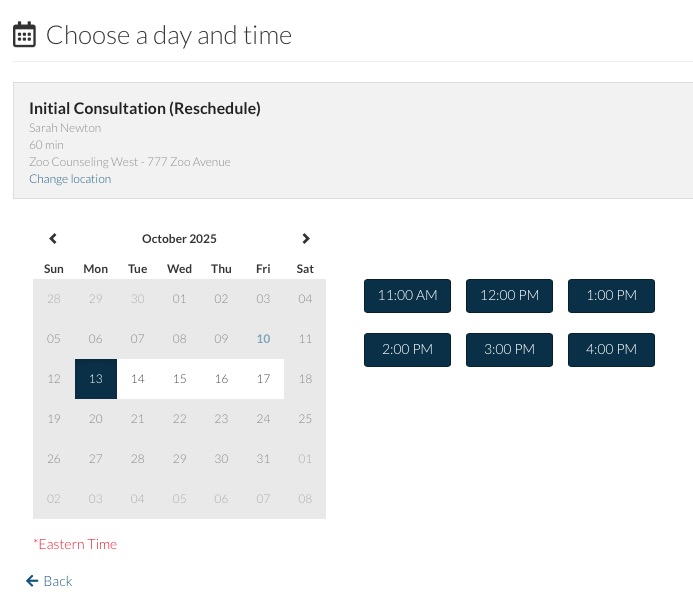 - When the client clicks Reschedule, the appointment calendar with the available time slots for that service will appear. The client can then select the date and time to which to reschedule the appointment.