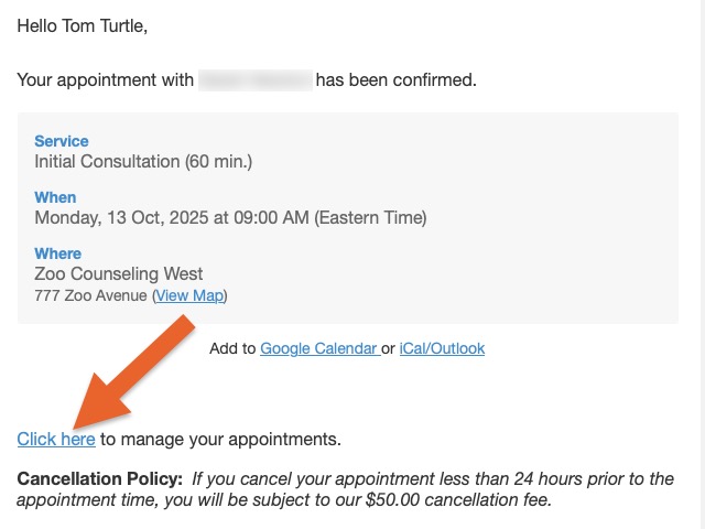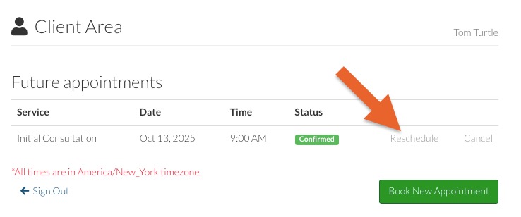PracticeQ gives your clients the ability to manage appointments they schedule with you, if you choose to enable this feature. This feature allows them to reschedule, cancel, or book a new appointment.