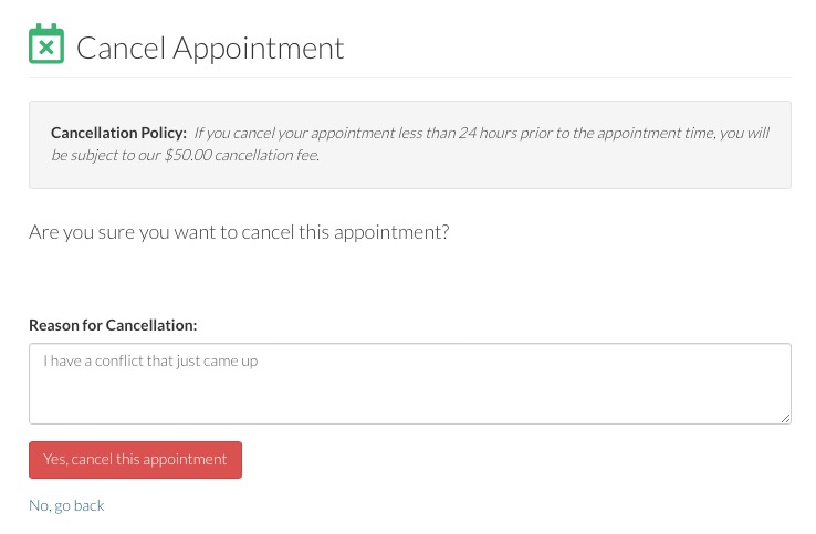 - When the client clicks Cancel they will be taken to the cancellation confirmation page. Here, they can enter a reason for the cancellation to be passed on to the practitioner. The cancellation policy of the service will be shown, and if there are any penalties for cancelling, they will display as well.