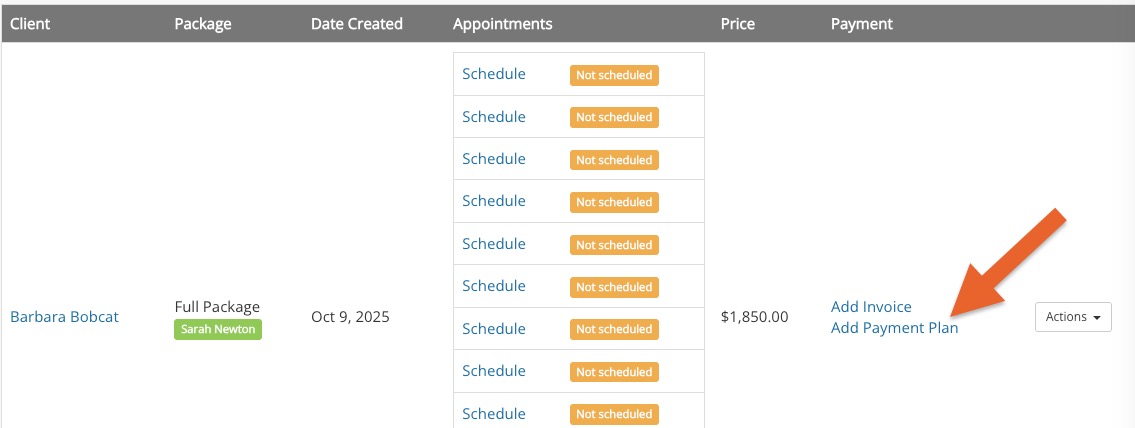 You can let your clients enroll in a payment plan when they purchase an appointment package through the booking widget, but first you must associate a payment plan with an appointment package. To do so, follow the steps below: