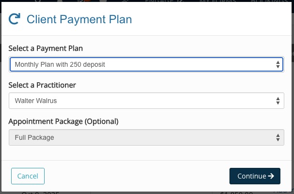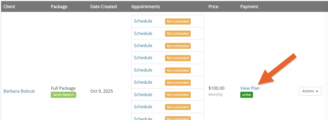 PracticeQ allows you to assign a recurring payment plan to an appointment package. You may also let your clients self-enroll in a payment plan when they book an appointment package online.