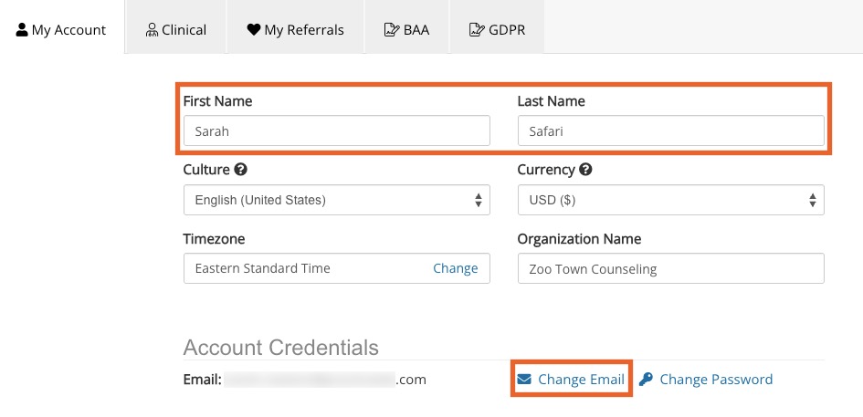 - To edit your email address, scroll down to the Account Credentials section and click Change Email. A pop-up will appear for you to enter and confirm the new email.