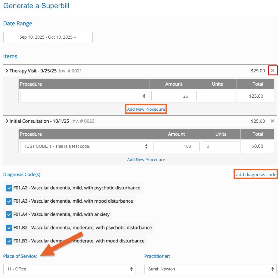 - Remove individual invoices from the superbill by clicking the X icon on the upper right of each invoice in the list.