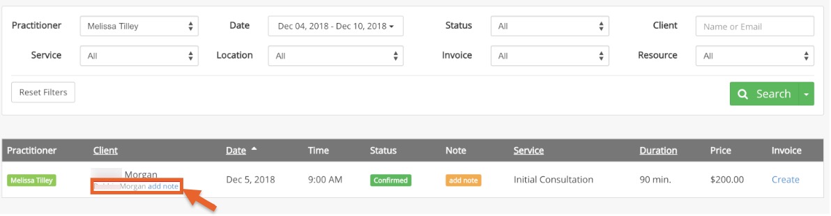 - Here you will see an add note link by the additional client name, listed under the main client name for the appointment.