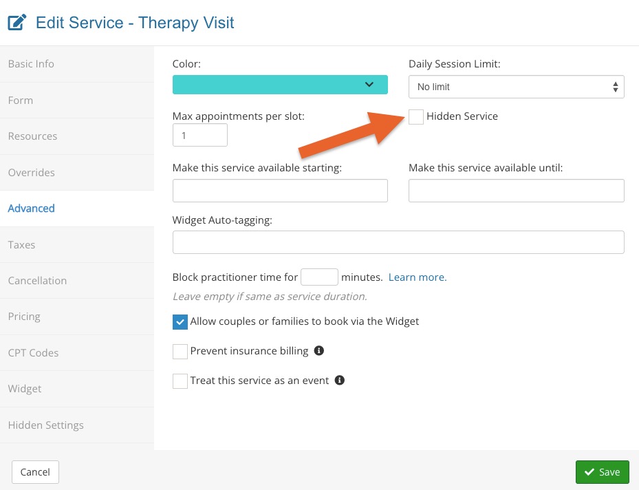 Perhaps you offer a service but not want clients to schedule it themselves in your booking widget. PracticeQ's booking system allows you to hide specific services so you can only book them manually from the back-end calendar.
