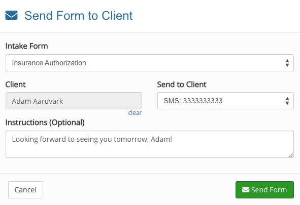 - Add a note to your client. This note is optional and will display above the first question of the intake form.