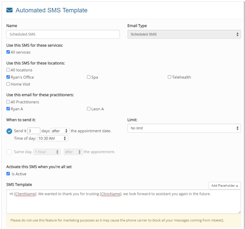 PracticeQ allows you to schedule SMS messages that will send to clients before or after their scheduled appointments.