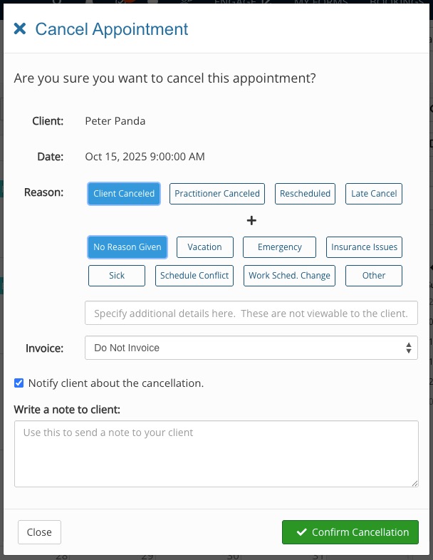 If the client or practitioner needs to cancel an appointment, you may cancel from the booking calendar. While canceling, you have options to enter reasons and invoice the client.