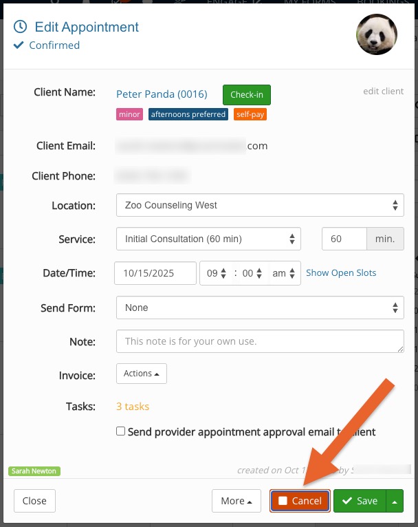 1. If the client contacts you to cancel their appointment, click the orange Cancel button in the appointment dialog.