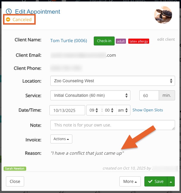 Note: This will also show the reason and note when the client canceled from the booking widget.