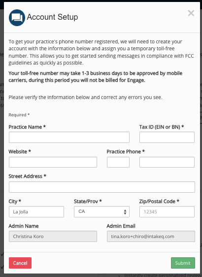 8. Once this has been submitted and a Toll Free number has been approved for each location, you will be able to access Engage from inside PracticeQ! You will receive a notification in 3-5 business days confirming the temporary Toll Free number that will get you started. You will be able to use your practice's phone number once it's approved to be compliant with 10DLC.