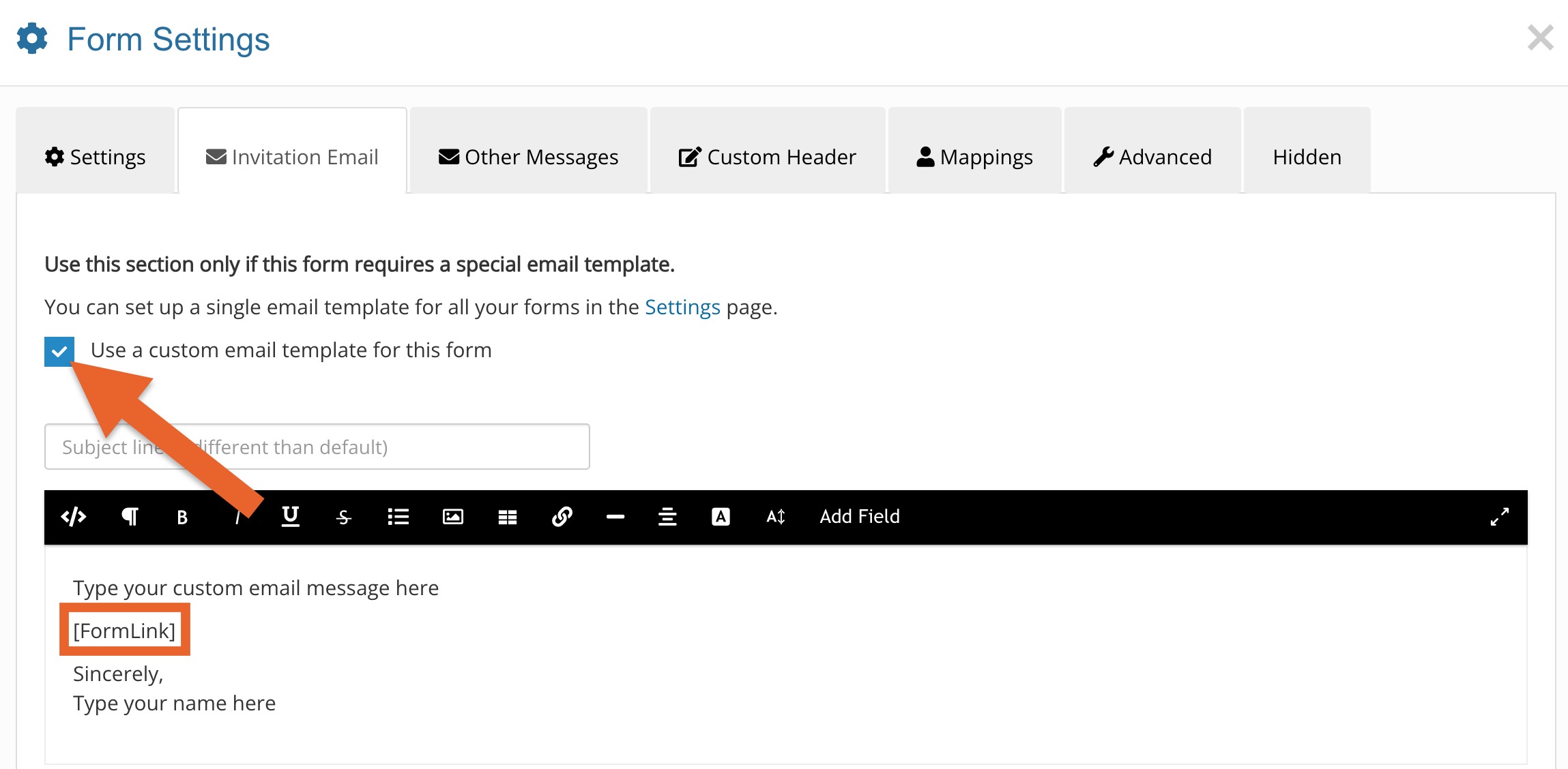 - Check the box labeled Use a custom email template for this form.