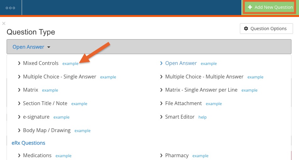 - Below shows all of the question types offered for questionnaires. Hover over the example links to see what each question type can do.