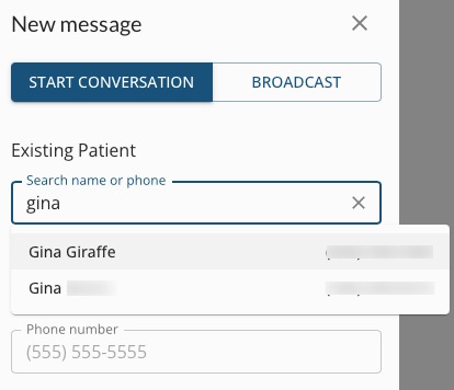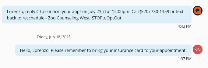 Engage - Send a Message in the Patient Communicator Use the two-way texting feature to text a client or contact in the Patient Communicator. Click Engage from your PracticeQ toolbar. Click Patient Communicator. Click Start Conversation. If the contact is an existing client, click in the Existing Patient field and begin typing the name of the client. A minimum of three letters is required to produce a list of search results. Select the name you want from the list. The message history with this contact will fill the screen. If the contact is not an existing client, enter the number in the Phone number field. If Engage recognizes the number as textable, the Name field will open. Enter the contact name and a new thread will open in the Patient Communicator. Message Options To send a free-form message, place your cursor in the message box and type your message. To use a message template, click the three lines icon and select a template from the list. To insert an image, click the portrait icon. To use a quick action (such as sending a review request), click the thunderbolt icon and select an action. To insert an emoji, click the smiley face icon. Click SEND to send the message immediately, or select an option to send it in the future. Message Types To see if a previously sent message was automated or free-form, refer to the icon on the right. Automated messages will display the PracticeQ icon. Free-form messages will display the user's initials. For more about Engage and how you can add it to your PracticeQ account, click here.