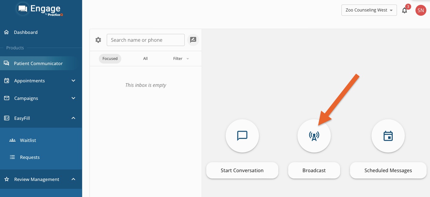 Note: Broadcast SMS messages should primarily be used for operational messages such as appointment reminders, office closures, and health updates. For marketing messages—such as promotions, offers, or sales-oriented content— we recommend using Email Campaigns.