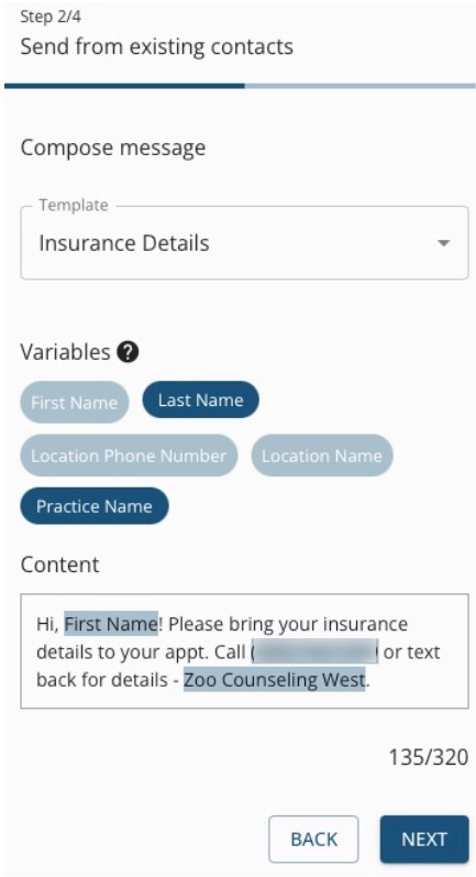 7. Choose a template from the dropdown menu or enter free form text into the Content field. If desired, click the Variables you wish to add to the message. Variables will pull specific information from each client's PracticeQ profile to make the message sound more personal.