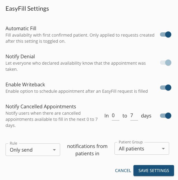 - When disabled, your practice can go to EasyFill → Requests and click the Manage button to see all clients who have confirmed their availability. You can then click Fill for the client that you prefer to give the slot to.